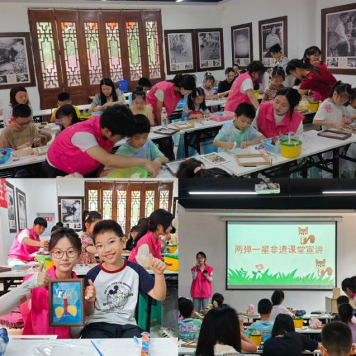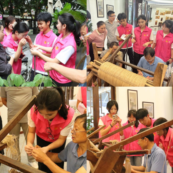 在夏布小镇,队员们走进加合夏布进行调研,非遗传承人潘老师详细介绍了夏布从苎麻种植到成品的完整工序——从苎麻剥皮、晾晒、绩纱,到织布机上的经纬交织,每一步都凝聚着古人的智慧。实践团成员们还参与到工坊“夏布拼图”的研学活动,运用专业所学指导参与活动的孩子们完成课程体验,并在活动现场开展了“两弹一星”精神和非遗宣讲。