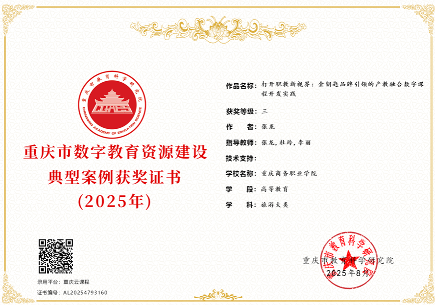 2025年8月底,重庆市教育科学研究院2025年度重庆市数字资源典型案例评选结果,在自主申报、单位推荐、资格审核和专家评审等层层严格筛选中,我院申报的案例《打开职教新视界:金钥匙品牌引领的产教融合数字课程开发实践》,经过多轮严格评审,荣获典型案例三等奖!