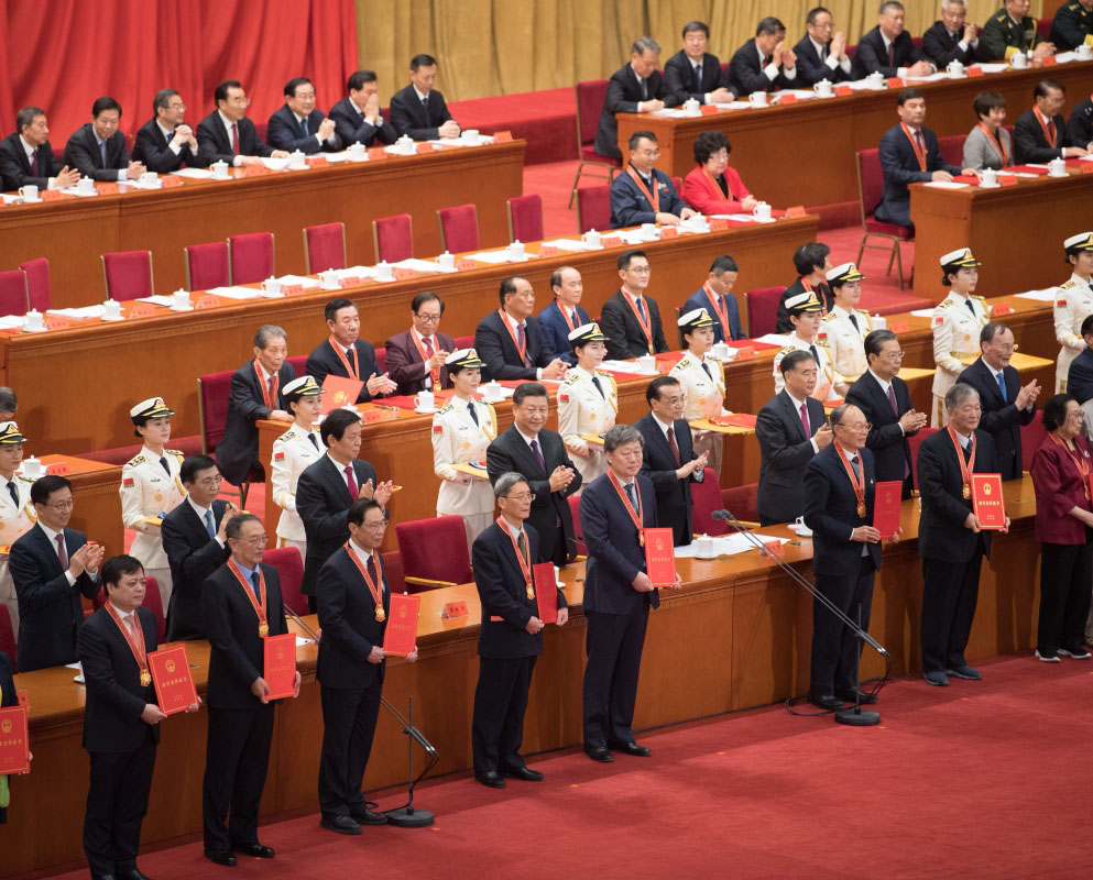 12月18日,庆祝改革开放40周年大会在北京人民大会堂隆重举行。中共中央总书记、国家主席、中央军委主席习近平在大会上发表重要讲话。这是习近平等为获得改革先锋称号人员代表颁奖。(新华社记者 鞠鹏 摄)