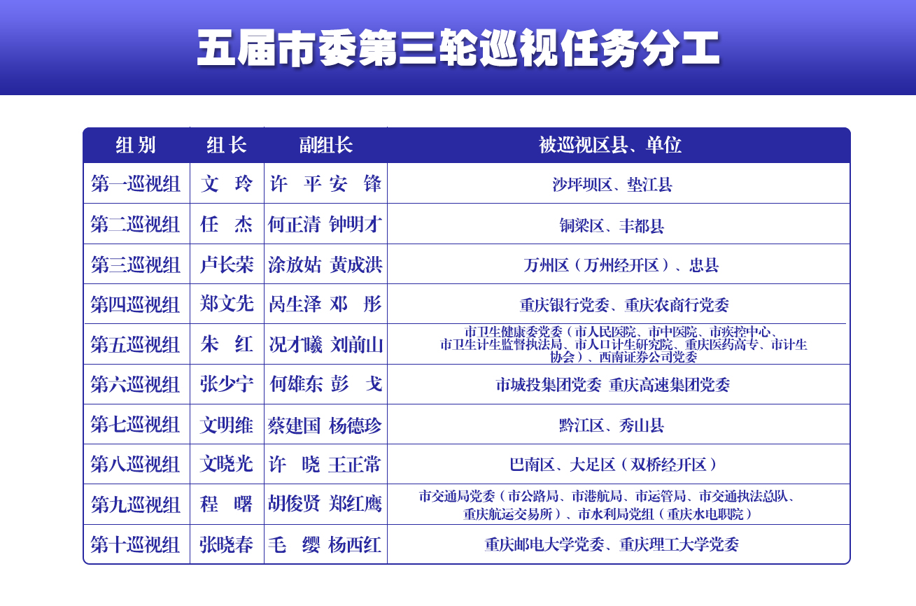 据悉,本轮巡视共组建10个巡视组,对10个区县、3个市级部门(含13个部门管理单位)、2所高校及5家市属重点国企党组织开展常规巡视。