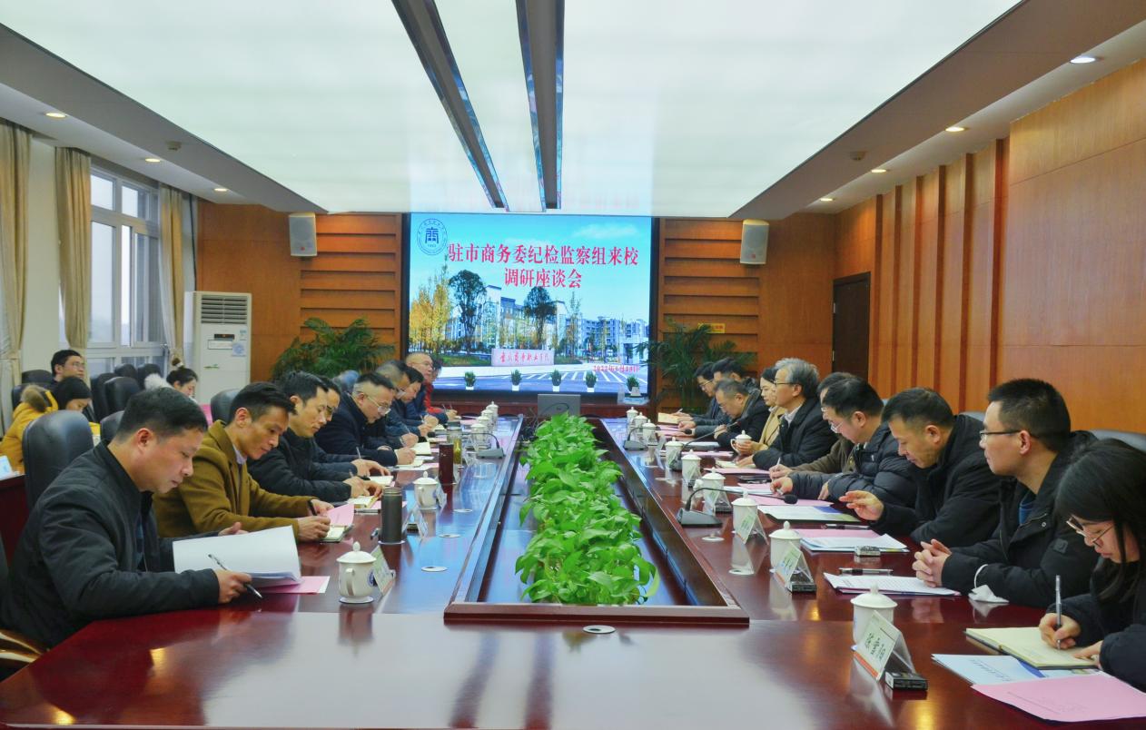 1月13日,市纪委监委驻市商务委纪检监察组赵荣华组长一行共10人莅临我校调研座谈,对学校贯彻落实全面从严治党部署要求,加强党风廉政建设和反腐败工作给予了充分肯定。