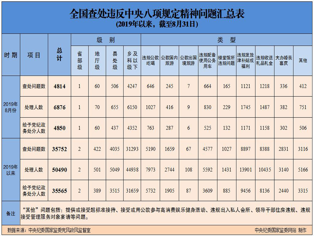 为掌握全国贯彻落实中央八项规定精神情况,中央纪委国家监委在各省区市和新疆生产建设兵团、各中央和国家机关、各中央企业和中央金融企业等建立了落实中央八项规定精神情况月报制度。2019年以来,截至8月31日,全国查处违反中央八项规定精神问题情况如下: