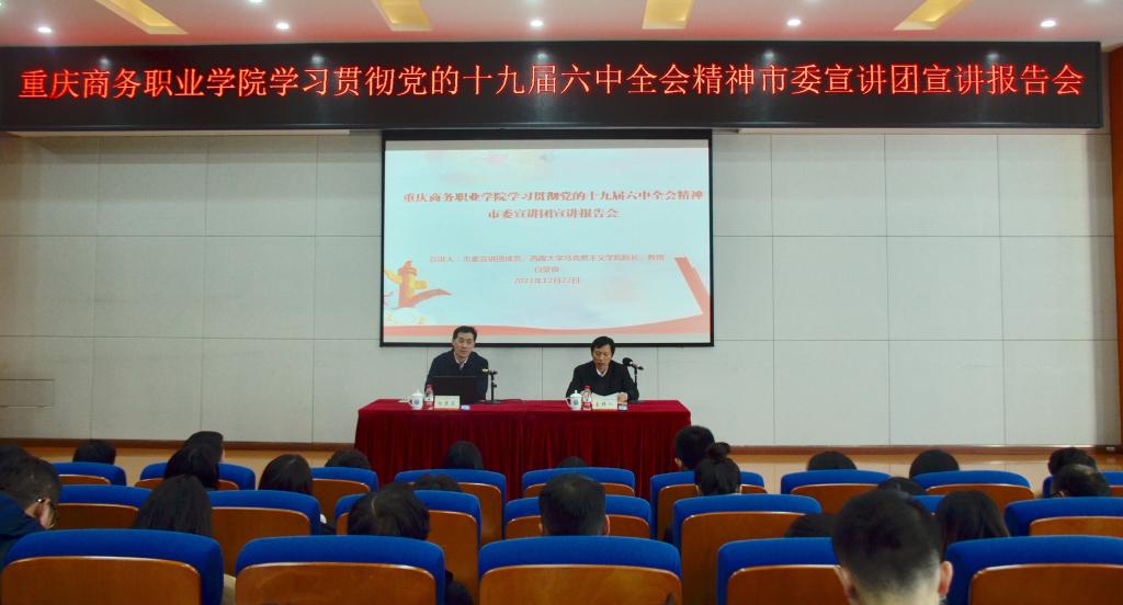 【文/图 党委宣传部】12月22日,学校学习贯彻党的十九届六中全会精神市委宣讲团宣讲报告会在学术报告厅举行,市委宣讲团成员、西南大学马克思主义学院院长、教授白显良围绕学习贯彻党的十九届六中全会精神开展宣讲。党委宣传部、马克思主义学院、通识教育学院教师,各学院师生代表,共计230余人现场聆听报告。报告会由党委委员、副院长张荣主持。