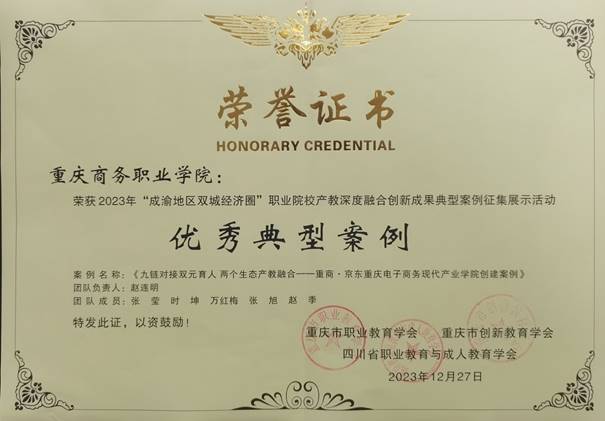 《九链对接双元育人 两个生态产教融合—重商·京东重庆电子商务现代产业学院创建案例》介绍了学校与京东集团采用“专业+产业”多元化办学模式,九链对接搭建校企合作平台,校企共赢落地教学服务创新,探索和实践校企双元运营机制,共建一个基地,融合两个生态,形成五个子基地,基于企业真实业务开展“六转变六融合”教法改革。打造了区域创新服务平台,构建了课程多元评价考核体系,建成了特色培养新模式和产教融合实训基地,人才培养质量明显提升,专业竞争力日渐增强。