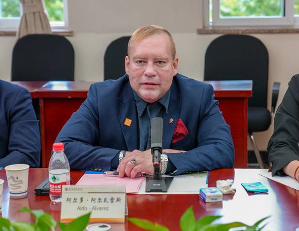阿尔多大使致辞,强调萨尔瓦多与中国、与重庆有着良好的合作基础,目前首都圣萨尔瓦多已与重庆市结为友好城市,合作空间广阔,教育合作更是大有可为。期待未来在科技创新、技能培训等方面能与重庆高校建立更深入的合作关系,派出学生来渝学习人工智能、跨境电商、网络直播等主流专业,同时也期待中国学生前往萨尔瓦多学习、工作,开展双向交流活动,促进学术交流与文化互鉴。