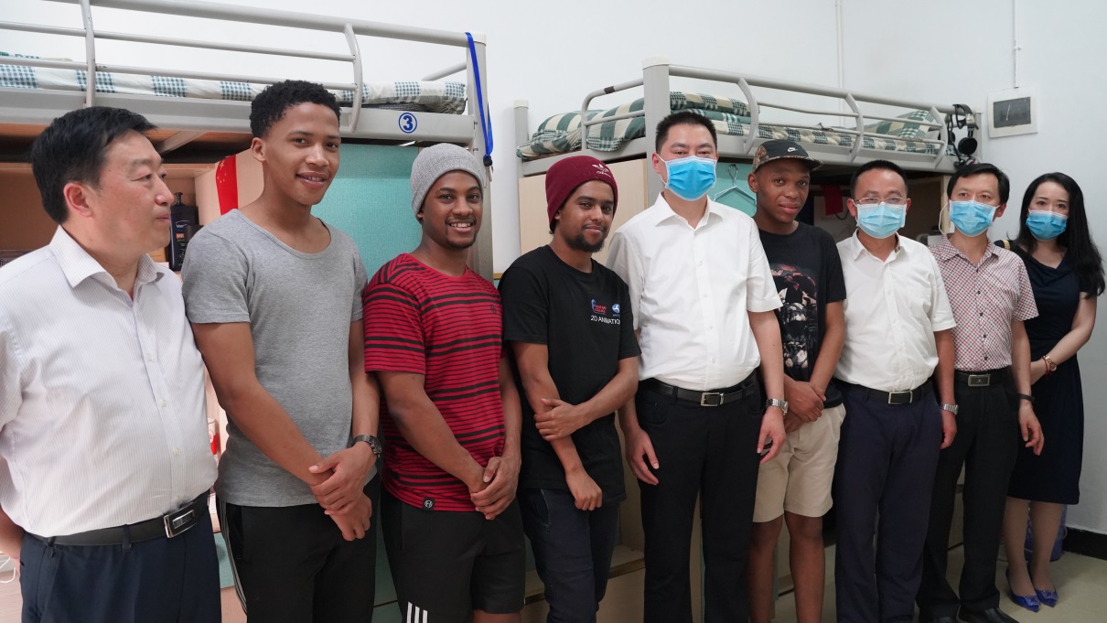 许新成一行来到留学生公寓,与留学生亲切交谈,询问他们疫情期间在校学习、生活情况,嘱咐留学生要做好科学防护,提高防范意识,安心在校学习生活。他谈到,重庆和南非的贸易往来十分频繁,每年进出口贸易额高达数百亿,特别是在电子商务领域的合作有巨大的潜力。他期望南非留学生把握学习机会,学好学精电商专业知识和技能,学成归国后为重庆和南非之间跨境电商贸易往来贡献力量。