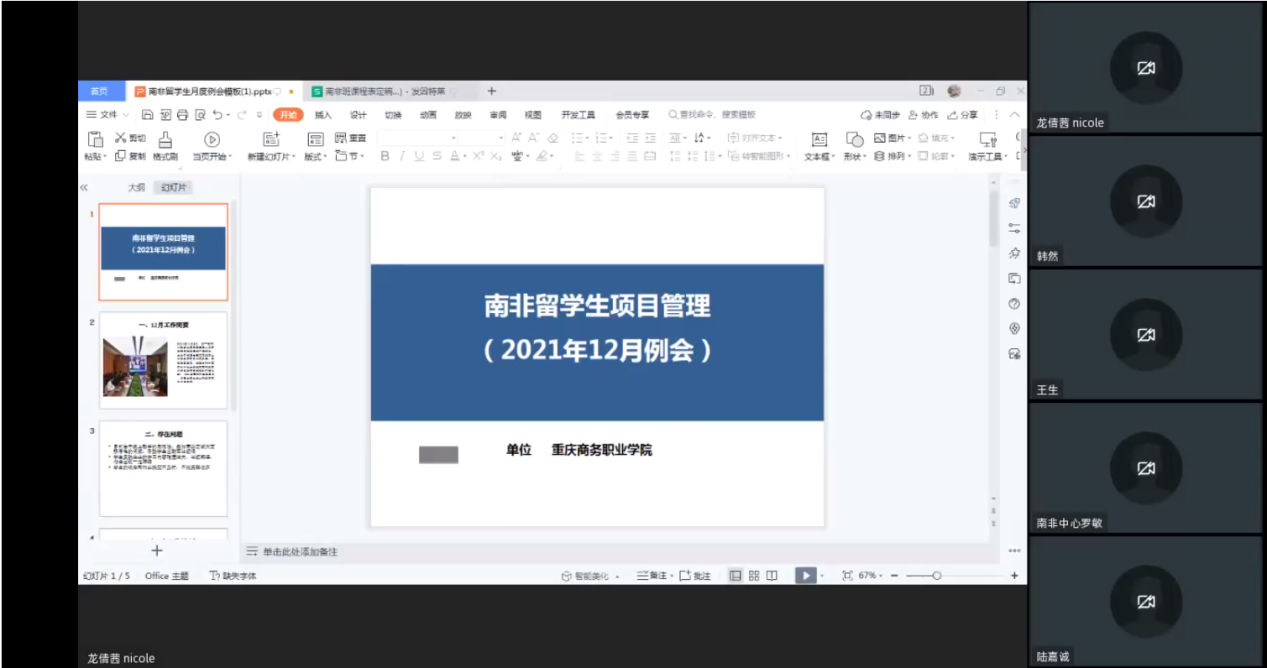 12月10日,重庆市人民政府外国留学生市长奖学金丝路项目南非跨境电商高级管理人员研修月度汇报通过线上方式举行。南非中国文化和国际教育交流中心负责人王震宇,阿里巴巴国际站重庆授权单位、南非中国文化和国际教育交流中心、经济贸易学院班主任,对外合作交流办负责人等参加会议。