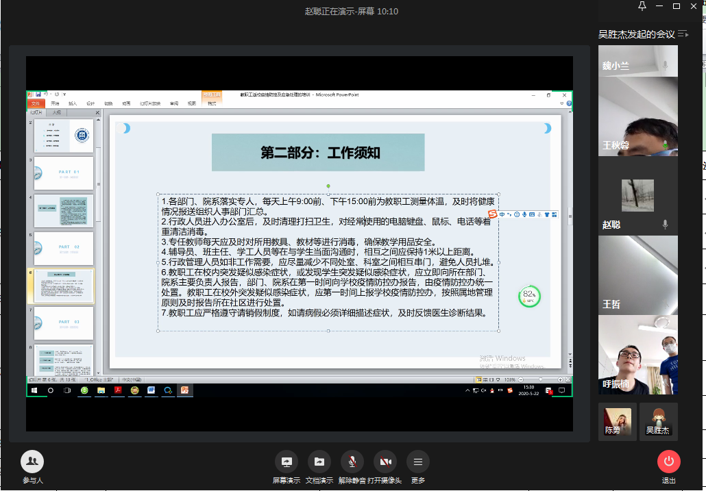 为全面贯彻落实市委、市政府和学校疫情防控工作要求,科学有效地做好部门疫情防控工作,提高防控和应对能力,保障教职工的身体健康和生命安全,维护正常的教育教学秩序,党政办公室于2020年5月22日开展线上疫情防控应急培训。