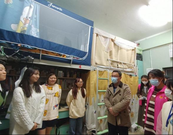【文/图 文化旅游学院】近期疫情形势严峻,为关心学生日常生活和学习思想状态,文化旅游学院学院党总支书记莫灼宇带领学院疫情防控专班人员走访学生宿舍,回应学生关切,解决学生问题。