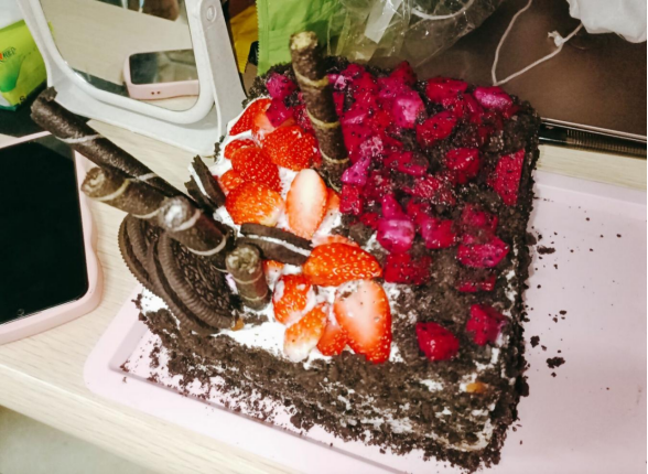 11月12日,莫灼宇一行在走访过程中,偶然遇见一间宿舍在为同学过生日。询问之下发现这是一个温暖人心的故事。当天是2022级社区管理专业1班学生代润梅同学的18岁生日,她表示在这浪漫的18岁,来自五湖四海的室友给她过了一个特别难忘的生日,室友在自己不知情的情况下就地取材,利用酸奶和奥利奥饼干亲手做了一个蛋糕,这份意外的惊喜,将成为人生中最难忘的回忆!最后代润梅同学还表达了对大学生活的展望与共抗疫情的决心。