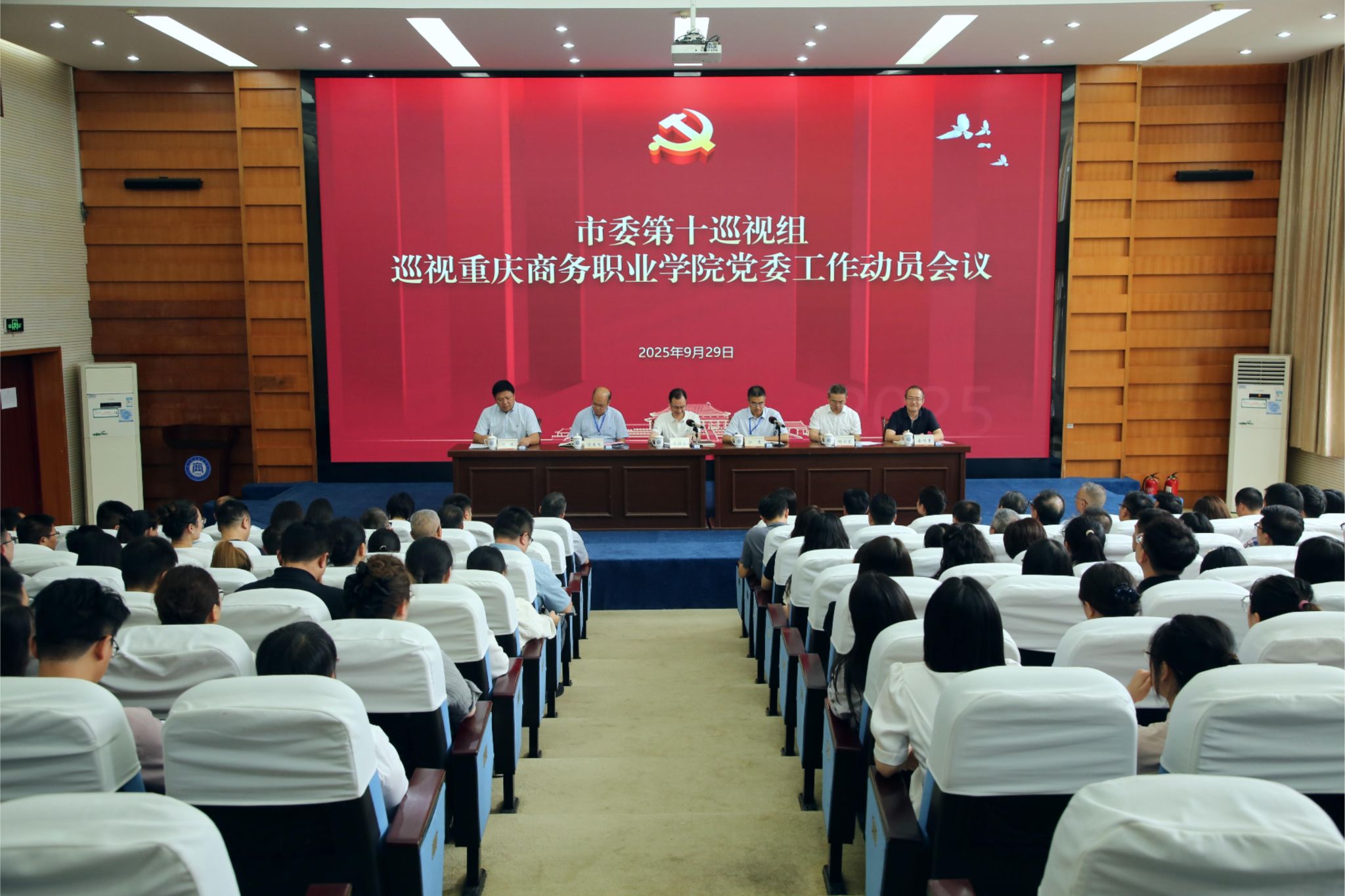根据市委巡视工作领导小组的部署,2025年9月29日,市委第十巡视组巡视重庆商务职院党委工作动员会召开。会前,市委第十巡视组组长蔡祥东主持召开与重庆商务职院党委书记江涛的见面沟通会,传达了市委书记袁家军在书记专题会议和市委常委会会议听取六届市委第六轮巡视情况汇报时的讲话精神。动员会上,蔡祥东就即将开展的巡视工作作讲话,通报了巡视任务,并就配合做好巡视工作提出要求;江涛主持会议并作表态讲话。