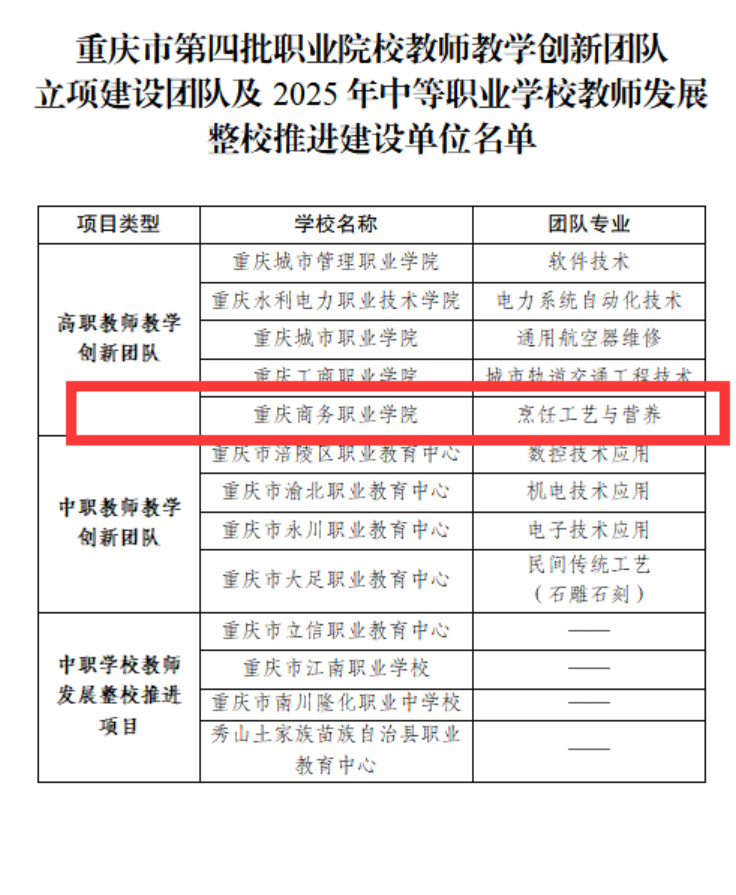 喜报:学校“烹饪工艺与营养团队”入选重庆市第四批职业院校教师教学创新团队立项建设团队