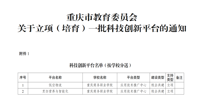 【文/图 科研处】近日,重庆市教育委员会正式印发《关于立项(培育)一批科技创新平台的通知》,我校申报的“低空物流应用技术推广中心”“烹饪营养与智能化应用技术推广中心”成功获批立项,这是我校在市级科技创新与转化平台建设领域实现的历史性突破。