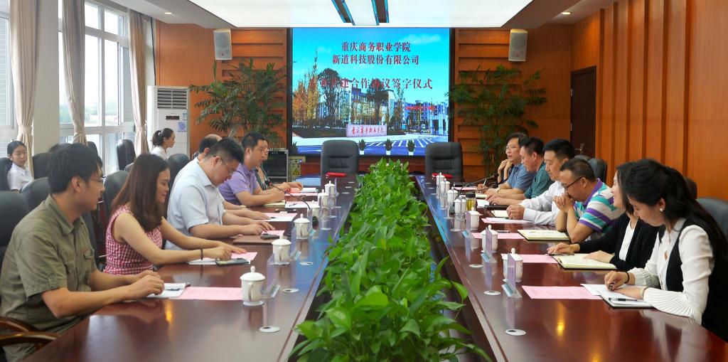 冉光学对新道科技股份有限公司副总裁宋健、重庆分公司总经理师唯伟一行的到来表示热烈欢迎,介绍了学校的专业设置、师资队伍、招生就业等基本情况,希望双方进一步深化产教融合,共同发展,共同进步,共同成长。