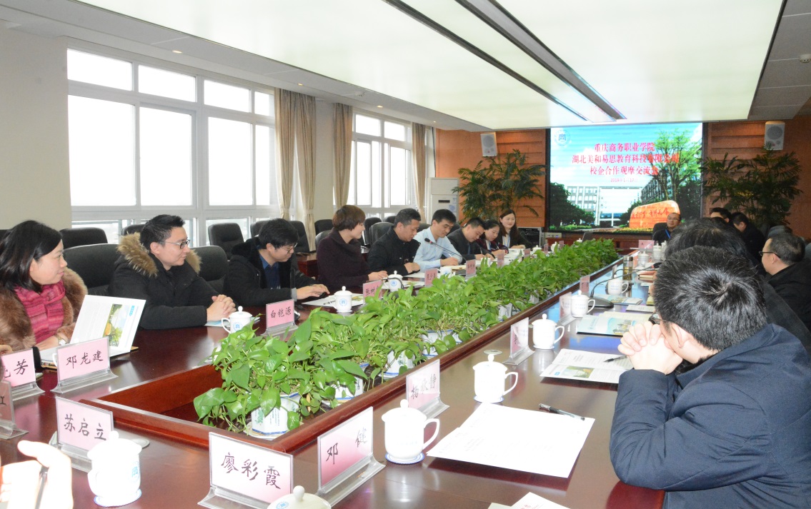 2019年1月17日,重庆商务职业学院与湖北美和易思教育科技有限公司校企合作观摩交流会隆重召开。重庆商务职业学院院长冉光学、副院长丁谦、学校各职能部门负责人、各二级院系院长(主任)、党总支书记参加交流会。湖北美和易思教育科技有限公司董事长兼总经理海克洪、副总经理张永龙一行出席观摩交流会。