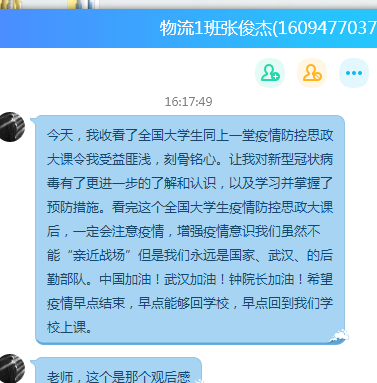 【文/图  思政教学部】“这是一堂别开生面的线上思政课!作为新时代青年,我们要让青春梦想在民族复兴的潮流中尽情绽放!”观看完“全国大学生同上一堂疫情防控思政大课”,国际贸易2019级1班黄杰同学激动地说。