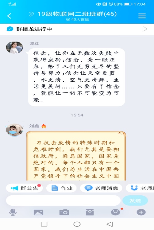 物联19级2班王雪同学呼吁:通过此次思政大课,我明白了人类命运共同体的重要性,人类只有一个地球,各国共处一个世界,我们应该互相帮助、和谐相处、共同发展。正如习近平总书记所引用的,“一花独放不是春,百花齐放春满园”,此次疫情也提醒我们,要提倡文明健康、绿色环保的生活方式,提高对自然的认识和态度,与自然和谐相处,更加文明地对待这个世界。面对未来我们必须要有风险意识,提高风险防范和化解能力,同时我们也要加强责任与担当,在青春中蝶变,共同为祖国发展做贡献!
