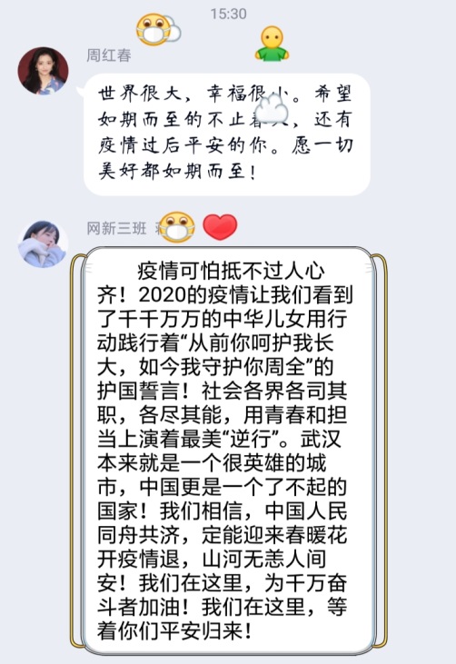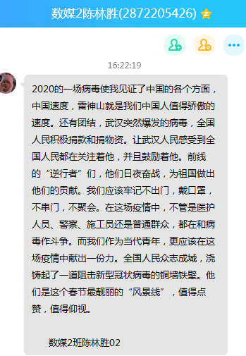 “在这次疫情中,涌现出一大批最美‘逆行者’,他们用自己的行动与力量担当起抗击疫情的时代使命和责任。”计算机网络技术2019(专本贯通)班陈铁浩同学表示。抗疫一线涌现出的动人故事深深感动着广大师生,传递出满满的正能量。