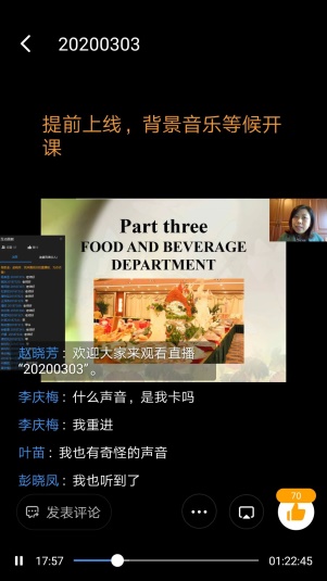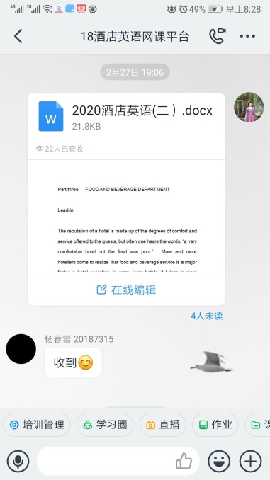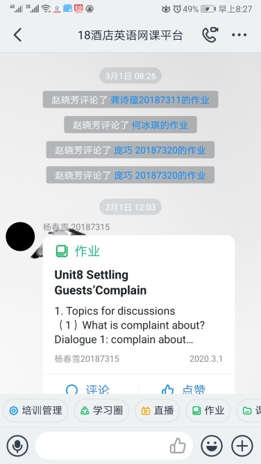 【文/图 餐饮旅游学院】学校餐饮旅游学院酒店管理教研室讲授《酒店英语》课程的赵晓芳老师积极探索“线下”与“线上”相结合的教学方式,引导学生树立科学可量化的学习flag,在线教学不流于学生“网上打卡”的形式主义,采用在线激励表扬,正向强化学生学习兴趣与动机。