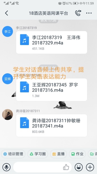 利用平台优势,在学习圈中给学生推荐好的专业网课,把学习累积时间计入平时成绩,在作业区将优秀作业和点评公示,达到教学相长的目的。要求因病未按时观看直播的同学通过直播回放进行学习。加强课后作业指导,要求学生两人一组完成对话,并上传。注重思想政治教育在课程中的不断渗透,将职业道德、爱业敬业融入课程。