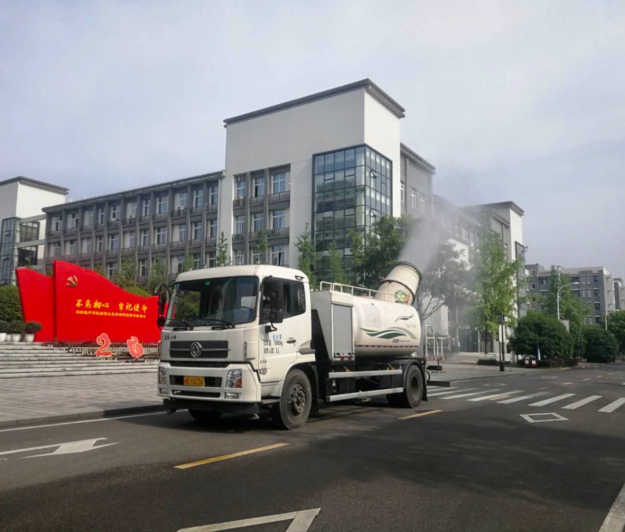 本次环境作业得到了沙区城管局的大力支持,该局向学校提供了一辆特种车辆和喷雾设备,帮助学校在开学复课前高效率、高标准完成了一次消毒防疫作业。