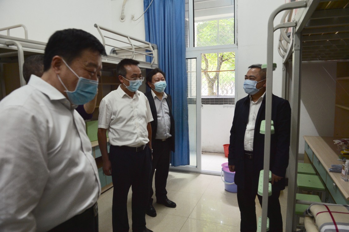 代建红一行实地检查了学校门岗、学生公寓、临时观察室、学生食堂等区域的疫情防控情况,详细了解了学生返校健康管理、食堂工作人员管理情况,听取了学校关于错峰开学的工作汇报。