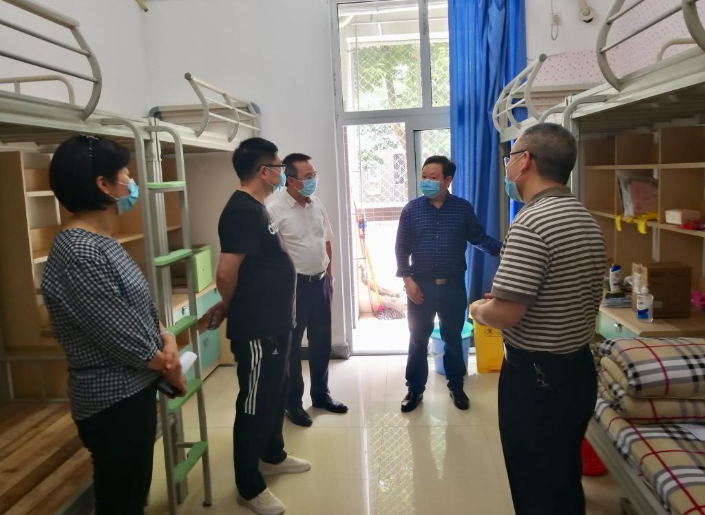 莫龙飞一行实地检查了学校门岗、学生公寓、隔离观察室、学生食堂等区域的疫情防控情况,详细了解了学生健康管理期间生活服务及开学后学生用餐等工作准备情况。