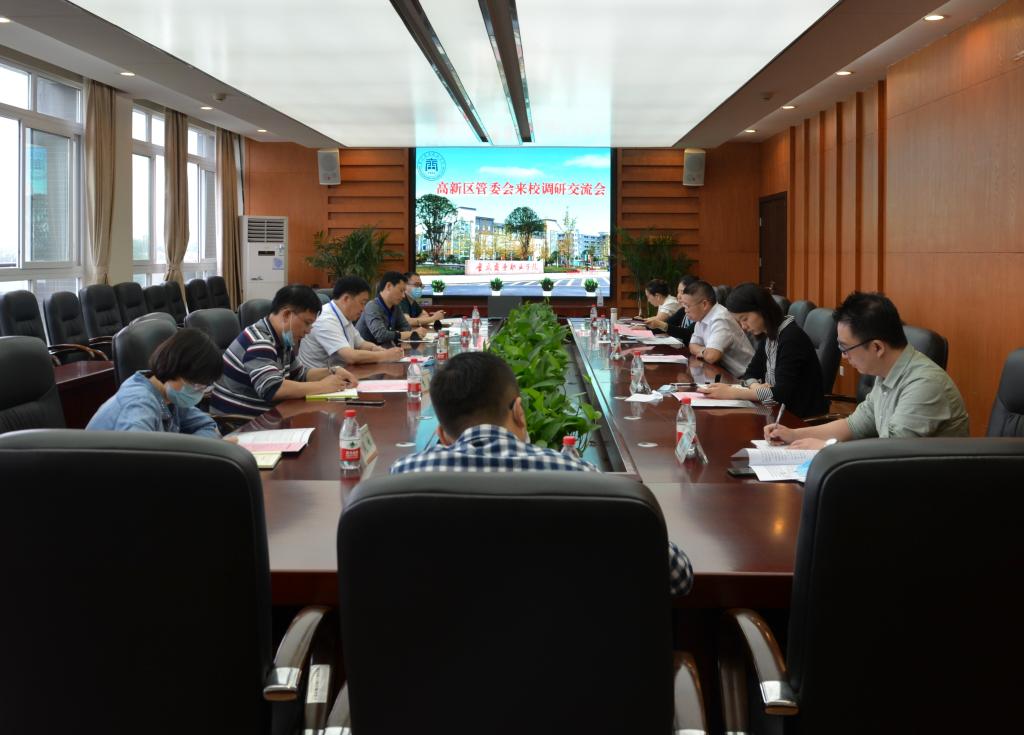 冉光学代表学校对高新区管委会领导一行的到来表示欢迎,简要汇报了近年来学校在人才培养、内涵建设、对外交流等方面取得的成绩。他表示,学校坚决落实中央、市委重大战略决策部署,举全校之力,进一步提升科技应用转化和服务经济社会发展能力,更好地服务成渝地区双城经济圈和中国西部(重庆)科学城建设。