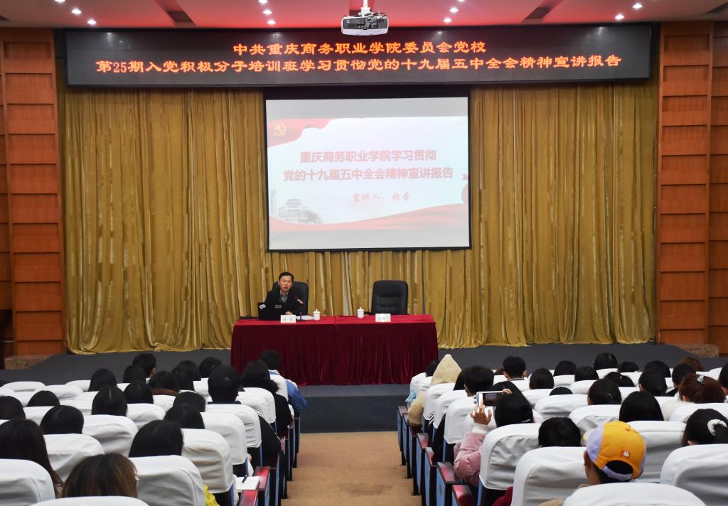 为确保培训取得实效,学校党校邀请了校领导、基层党组织书记、思政教师、专职组织员等为学员们授课。党委委员、副院长张荣作学习贯彻党的十九届五中全会精神专题报告,他从党的十九届五中全会基本情况,全面把握新发展阶段,深刻认识构建新发展格局,坚持党的全面领导,动员各方面力量为实现“十四五”规划和二○三五年远景目标而团结奋斗等方面,用详实的数据、具体的事例、生动的对比,为大家展示了全会擘画的宏伟蓝图。