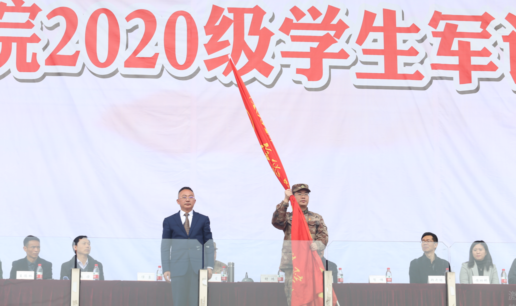 谭勇向本次军训团授旗,军训团副团长贺伟接过旗帜,紧握高举,旗帜在风中飘扬。