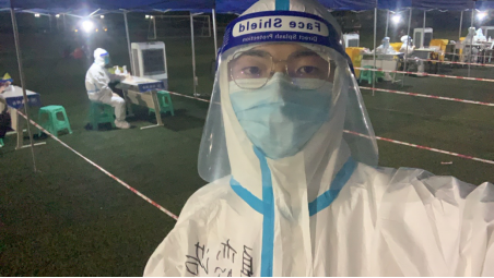 2019级计算机网络技术专本贯通班夏恋浩同学是核酸检测志愿者中的一员,他的工作是维护各个核酸检测登记台硬件和软件的正常运行和对核酸检测的人员进行身份信息登记,同时配合医务人员发放核酸检测试管并对其进行编号。他说“当我穿上防护服并在胸前写上自己姓名时,我就是一名战士,深知自己的责任与担当。”