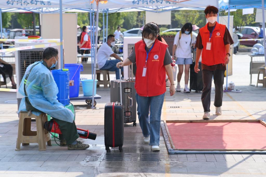 在疫情防控常态化的背景下,学校为保证在校师生的健康安全,严防外输,在学校大门设置了学生引导和专用通道,每个学生经过体温监测,行李消毒等环节后入校。入校后,也有热心的团学干部与志愿者们主动帮忙拎行李,为新生们指引方向。烈日炎炎,尽管工作十分繁琐,但大家仍然没有丝毫懈怠,以饱满的精神状态迎接新同学的到来。