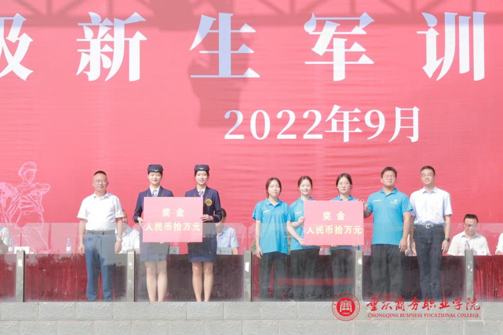 副院长丁谦宣读了《关于表彰2022级学生军训先进集体和个人的通报》《关于表彰2022年全国职业院校技能大赛获奖团队的通报》。训练标兵、优秀教官、优秀指导员、全国职业院校学生技能大赛获奖学生代表依次上台领奖。