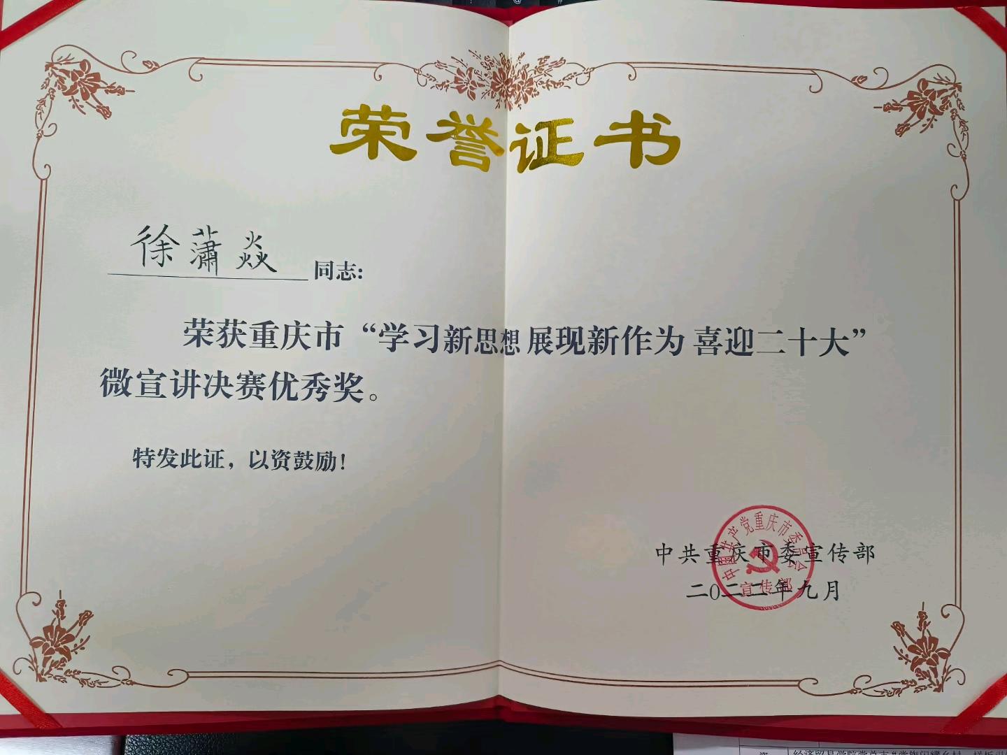 【文/图 党委宣传部】近日,在全市“学习新思想展现新作为喜迎二十大”微宣讲活动中,学校报送的《在青春的赛道上奋力奔跑》理论宣讲微视频荣获“2022年度全市优秀理论宣讲微视频”和“2022年重庆市高校系统优秀理论宣讲微视频”。