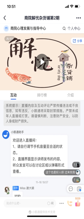 【文/图 学生工作部】11月以来,学校学生工作部大学生心理健康中心积极探寻云端心理辅导途径,创新工作方式与学生展开心与心的交流。中心结合德、智、体、美、劳等领域,集结校内优秀专业教师队伍,通过云端舒心讲堂的形式,为同学们呈现丰富多彩的知识领域,如“越剧唱腔体验”“瑜伽体式体验”以及“关注营养 守护健康”等,吸引了一大批同学关注的目光,舒心讲堂累计开展7期,在线学习学生人数1万余人。为方便大多数同学倾诉心声,除常规心理咨询服务以外,中心特别开展“解忧杂货铺”线上连麦倾诉活动,开通2期以来共有20余名同学线上连麦,观看学生2000余人次,收到点赞1.6万人次。中心还特别邀请校外专家队伍为同学们讲授专题心理辅导报告,报告内容从负性情绪心理机制及应对策略、新形势下就业心态以及策略调整、大学的自我成长,不乱于心等方面展开,同学们踊跃互动,纷纷点赞老师们的讲解,累计观看学生6万人次,收到点赞50余万人次。