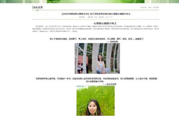 期间,中心发布《如何处理宿舍人际关系》等心理推文10余篇,校内外心理援助资源20余条,累计浏览量2000余人次,累计接待线上线下咨询师生30余人次,各学院辅导员还亲自为同学们撰写暖心小贴士20余条,鼓励同学们积极调整自我心态,专注当下学业,注重自我本领增长。