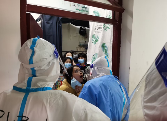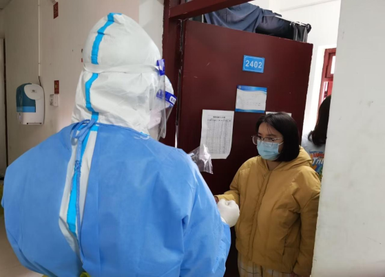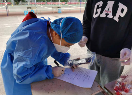 11月27日,应承晏、孙建川、朱锡双、陈卓四名志愿者,在紧急情况下主动挑起核酸检测“扫楼”的重担,从中午12:30分进入宿舍,直到晚上8点才完成采样工作。应承晏同学经过培训,获得了卫健委颁发的资格证,于是他主动提出承担送检核酸样本的工作,整天顾不上吃饭,工作直至深夜。