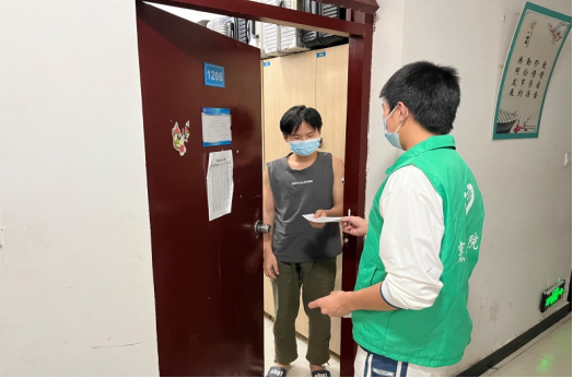 在班级群里,组建志愿者的消息一发出,同学们纷纷响应,“我行”“我来”“我是入党积极分子,我上”,短短的30分钟,一支志愿者队伍组建完成。他们分工明确,按照学校的疫情防控要求,值守在各自的岗位上。负责寝室区域的志愿者们,分散在每一个寝室楼门口,为进出人员测体温并登记,各楼道的志愿者每天为各个寝室更换出入单,对每个寝室出门取餐的两名同学进行登记;负责食堂区域的志愿者们,对进出食堂的人员做好体温检测,引导取餐人群保持安全距离、有序取餐;负责隔离观察室的志愿者们,更是不辞辛劳地在几百步阶梯之间来回冲刺,为健康监测人员配送三餐和物资,满足日常需要;负责核酸检测的志愿者们,不仅协助布置核酸场地、准备核酸检测用品,更是为了不遗漏一人,逐层通知同学们,还在核酸检测进行时,维持现场秩序、细致地登记并核对人数。