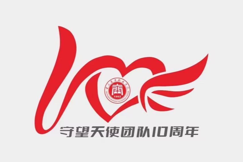 守望天使10周年活动logo:10年文字融合右侧守望天使团队徽章环抱校徽,象征守望天使团队全体成员紧密团结在学校党委周围