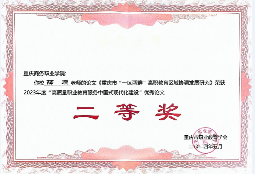 会议颁发了第二批智库专家证书,学校党委副书记余晓玲、副院长管军等6位教师被聘为重庆市职教学会第二批智库专家。此外,学校教师薛瑾的论文《重庆市“一区两群”高职教育区域协调发展研究》荣获2023年度“高质量职业教育服务中国式现代化建设”优秀论文二等奖。