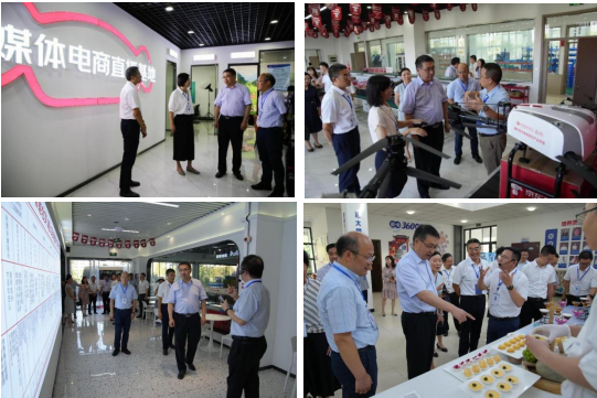 (调研乡村振兴电商直播室、无人机飞服中心、京东企业生态馆、餐饮实训楼)