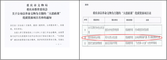 【文/图 马克思主义学院】近日,在重庆市文物局和重庆市教委联合公布的2024年革命文物“大思政课”优质资源项目名单中,学校选送的“生命诠释英雄气概 烈火铸就精神丰碑”作品成功入选,成为全市30项优质资源之一(高职院校仅7项入选)。市级“大思政课”优质资源建设评选属于重庆市新时代学校思政课建设2024年重点任务之一,该项目的成功入选标志着学校顺利完成一项2024年重庆市新时代学校思政课建设重点任务。
