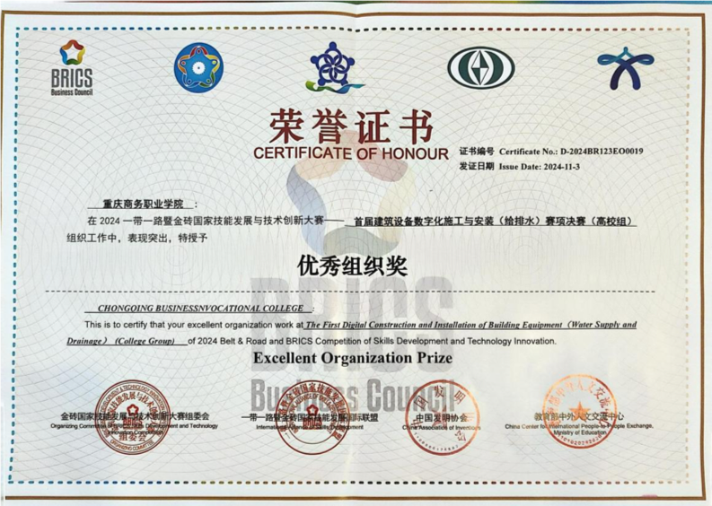 【文/图 财经管理学院】11月1日至3日,2024“一带一路”暨金砖国家技能发展与技术创新大赛首届建筑设备数字化施工与安装(给排水)赛项全国总决赛在浙江建设职业技术学院隆重举行,来自全国高校的128支队伍参加了大赛。