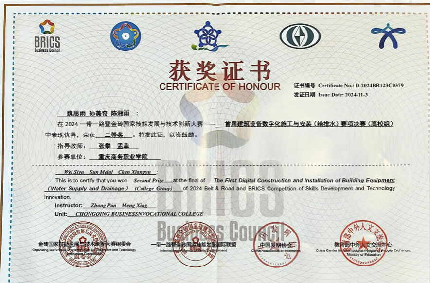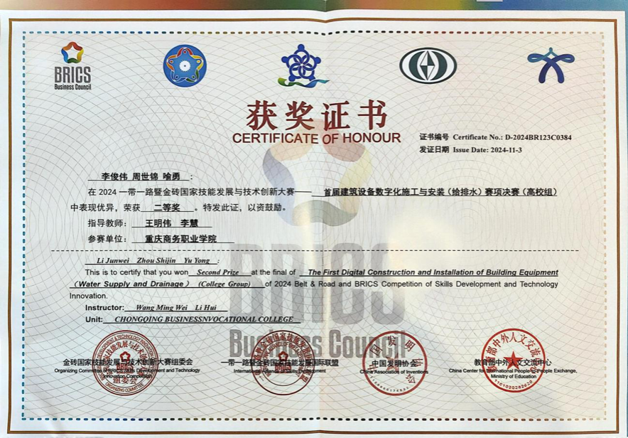 财经管理学院获2024“一带一路”暨金砖国家技能发展与 技术创新大赛首届建筑设备数字化施工与安装(给排水)赛项全国总决赛二等奖