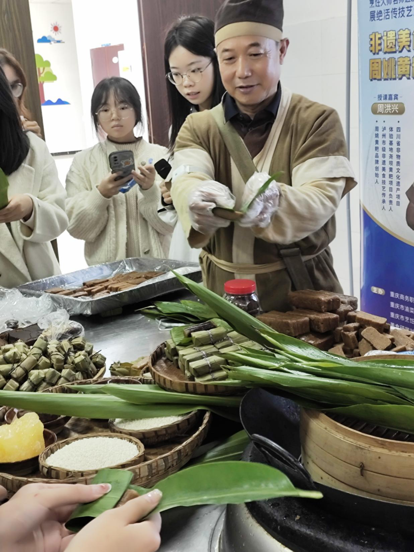 周大师亲自示范了黄粑的传统制作工艺过程,他指出,制作黄粑的关键就在于良姜叶独特的香气。同学们积极地参与到黄粑制作过程,从煮叶、蒸叶到最后的包制,周大师都进行了详细的讲解,让同学们感受到了传统工艺的魅力、美食制作的乐趣以及大师的匠心精神。
