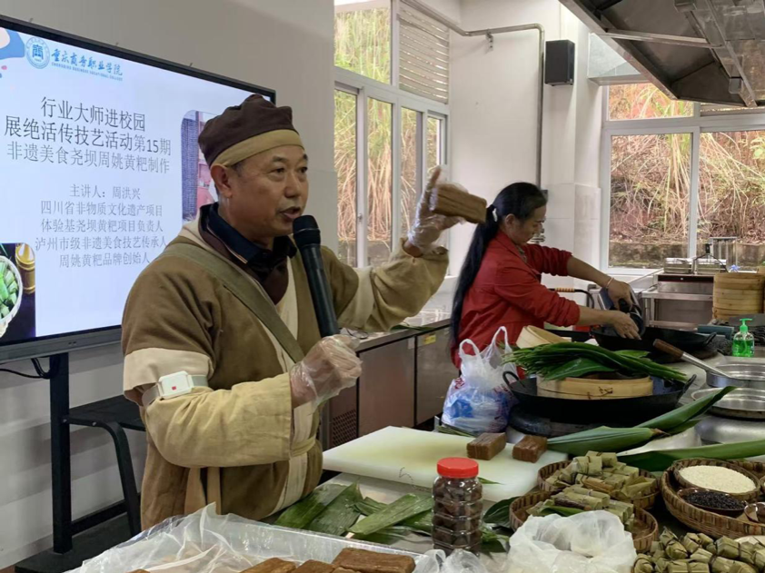 【文/图 烹饪学院】11月13日,烹饪学院行业大师进校园“展绝活传技艺”活动第15期在烹饪实训中心智能演播厅举行。本次活动邀请到了周姚黄粑品牌创始人周洪兴大师为烹饪专业师生、美食研学社、烹饪科学技术科普社的美食爱好者授课,主题为非遗美食尧坝周姚黄粑制作。