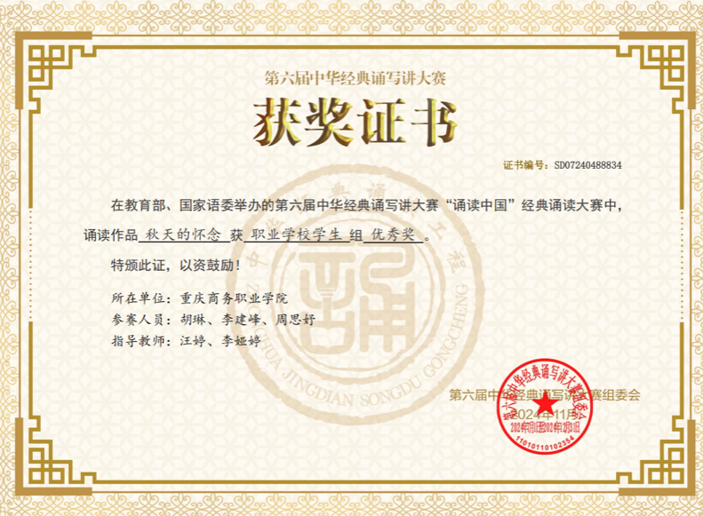 近日,全国第六届中华经典诵写讲大赛“诵读中国”经典诵读大赛评奖结果出炉,学校选送的作品《秋天的怀念》获得职业学校学生组优秀奖。
