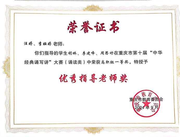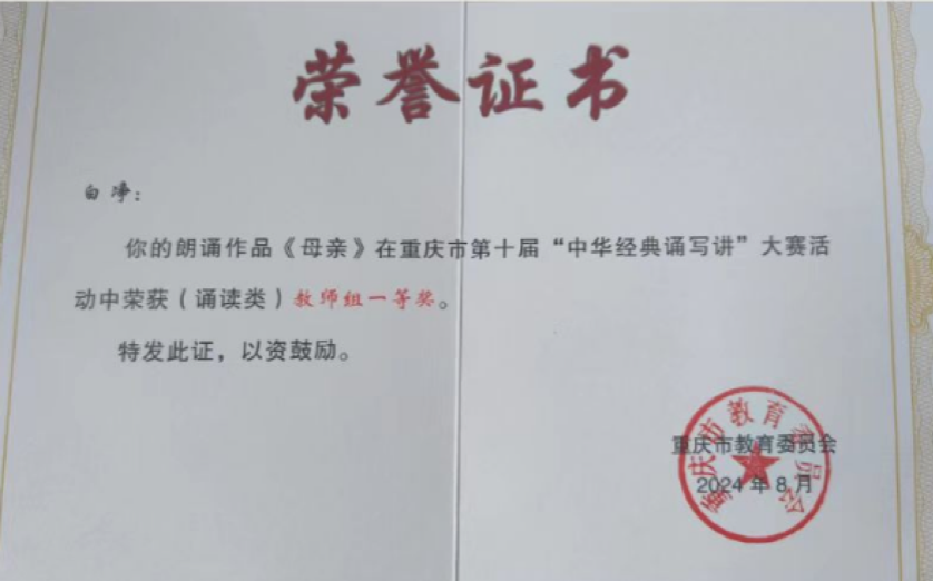 此外,在重庆市第六届中华经典诵写讲大赛“诵读中国”经典诵读大赛中,学校选送的两组职业学校学生组作品和一组教师组作品均获得市级一等奖,此次教师组作品《母亲》由团委白净老师选送参赛。