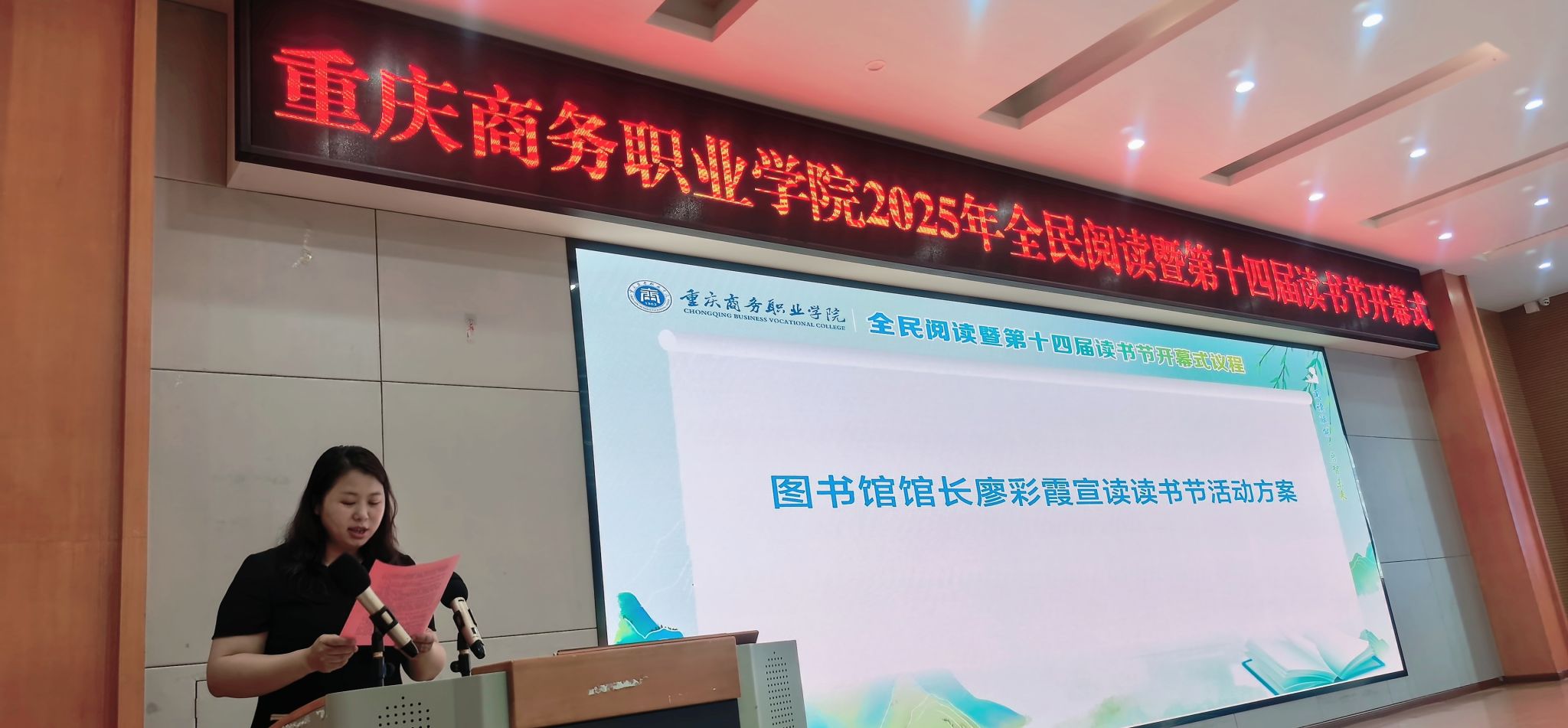 图书馆负责人宣读了读书节活动方案。她表示,今年读书节活动主题突出“AI+阅读”与“文化传承”双线融合。建立多维育人体系,创建立体阅读生态。在创意表达维度和深度体验层面上借助数字媒体技术和人工智能等先进技术,重整阅读资源、重塑阅读过程,重建阅读评价体系。