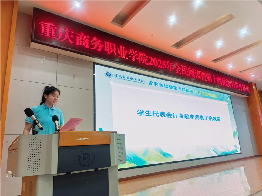 学生代表学校广播台负责人、会计金融学院袁子怡同学发言,分享了《阅读,点亮心灵的灯塔》,书香润泽心灵,阅读成就未来,鼓励重商的青年学子们用阅读点亮心灵的灯塔,照亮前行的道路,书写属于青年们的精彩人生。